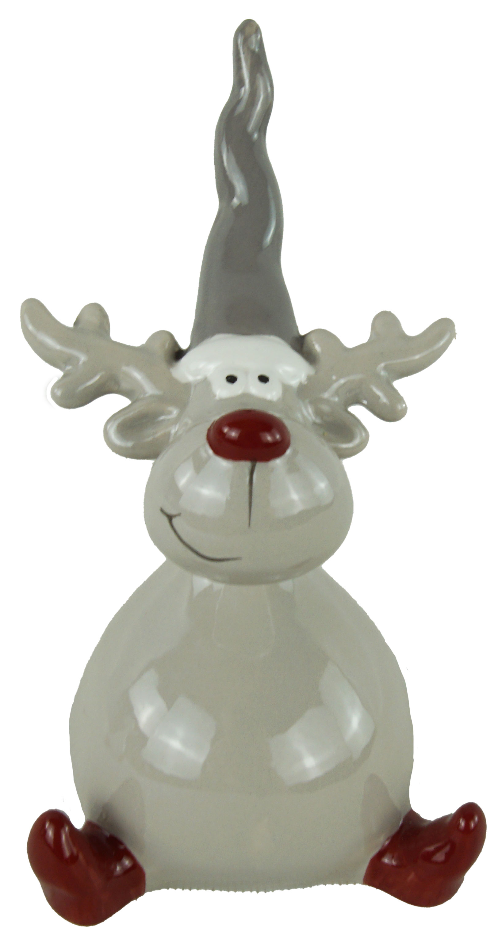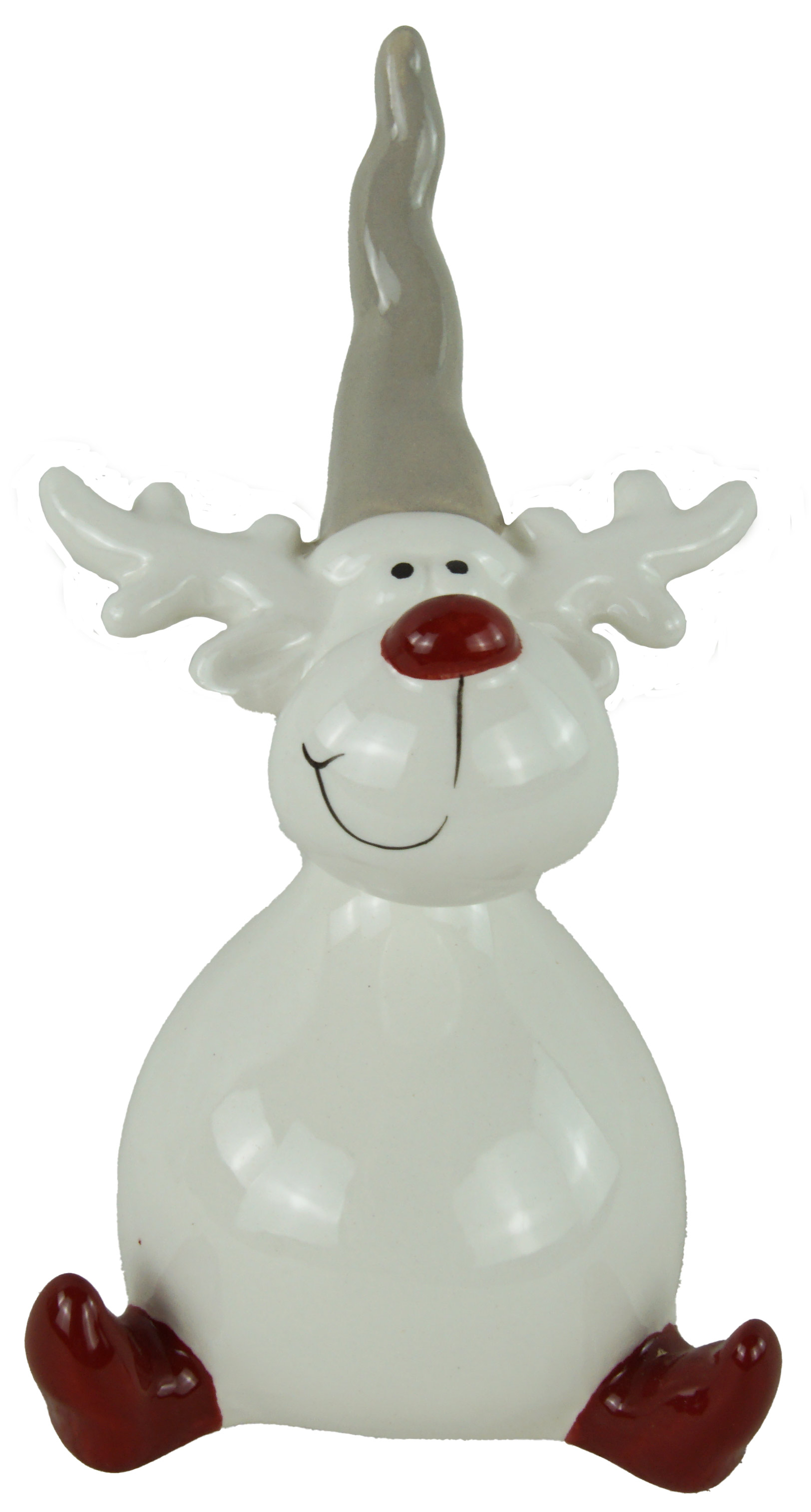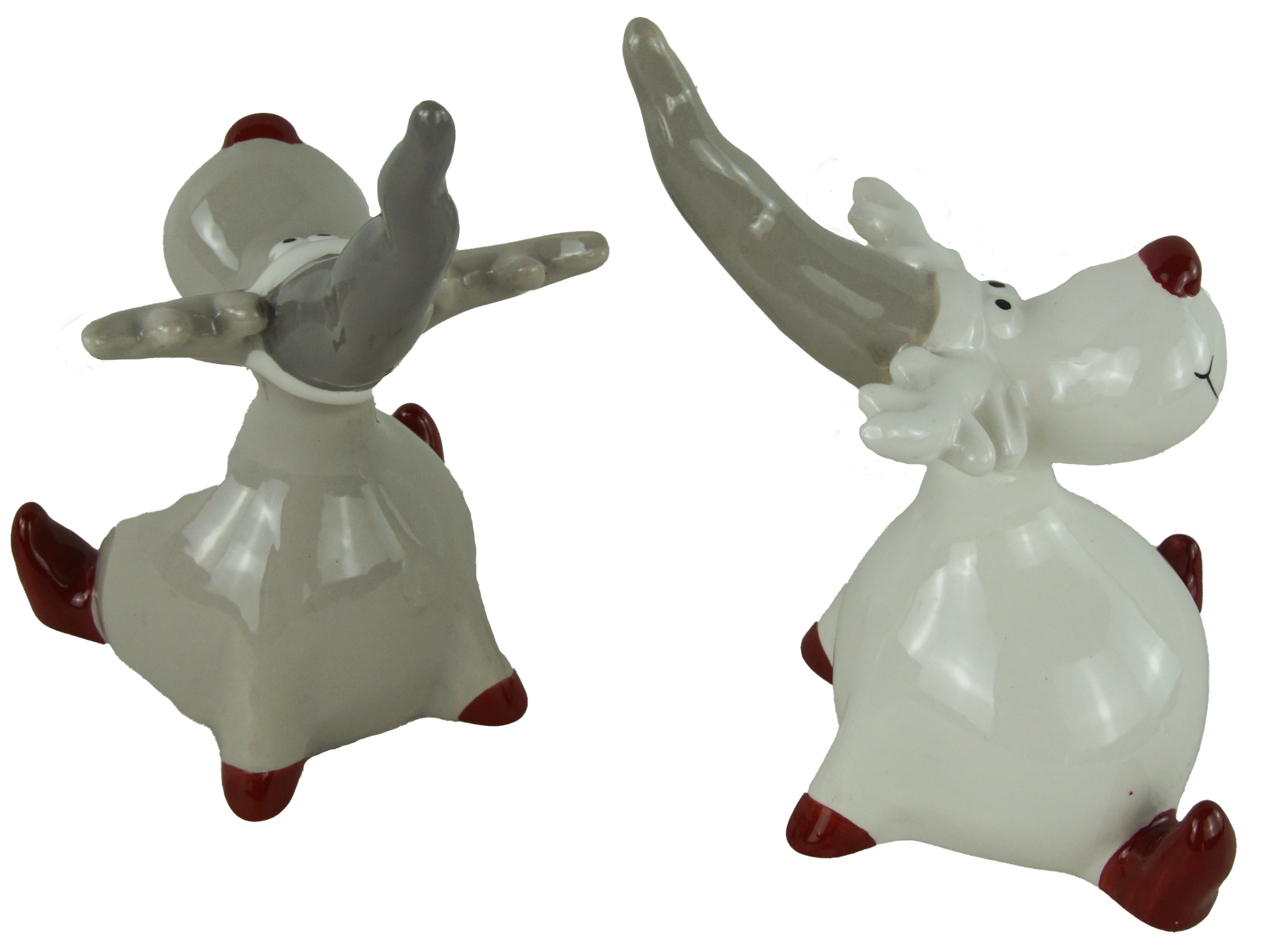 Ein Elch ist grau, der andere weiß, beide tragen graue Zipfelmützen, haben rote Nasen und rote Stiefel.