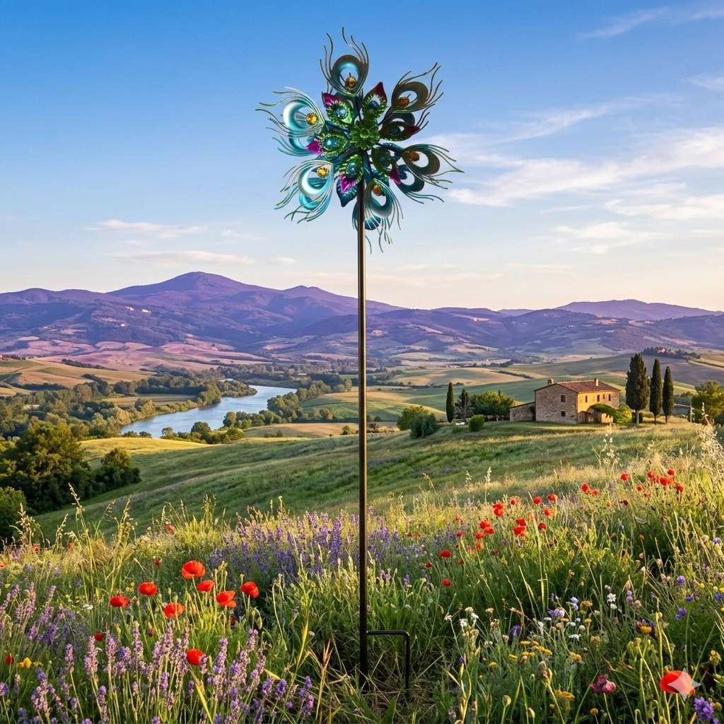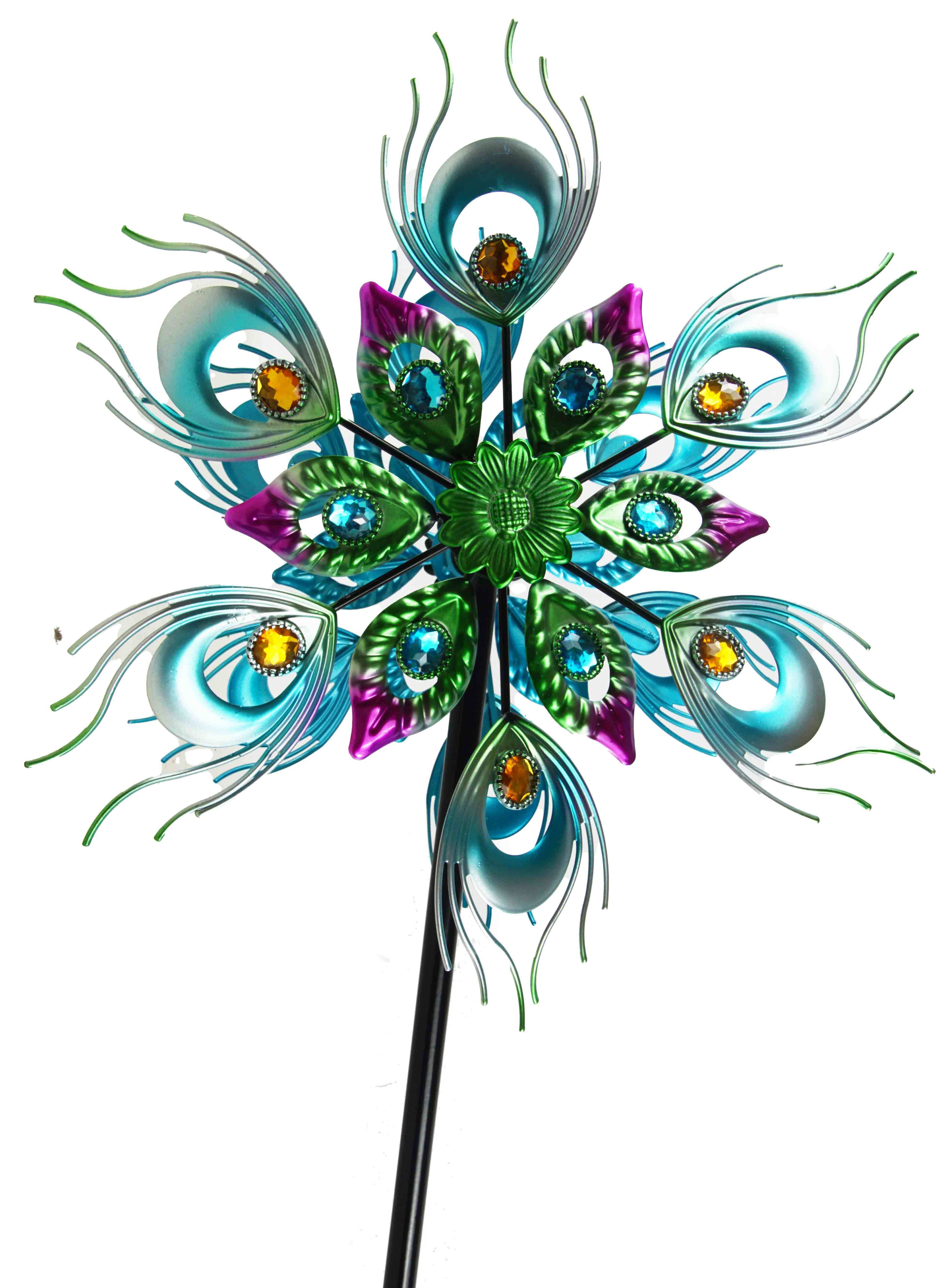 Dieses dekorative Windrad bringt Bewegung und Farbe in Ihren Garten. Mit einer Höhe von ca. 122 cm und doppellagigen Rotorblättern im eleganten Pfauenfedern-Design zieht es alle Blicke auf sich. Die blau-metallic schimmernden Federmuster und die bunten Schmucksteine sorgen für ein faszinierendes Farbspiel im Wind. Ideal für eine stilvolle Gartengestaltung.