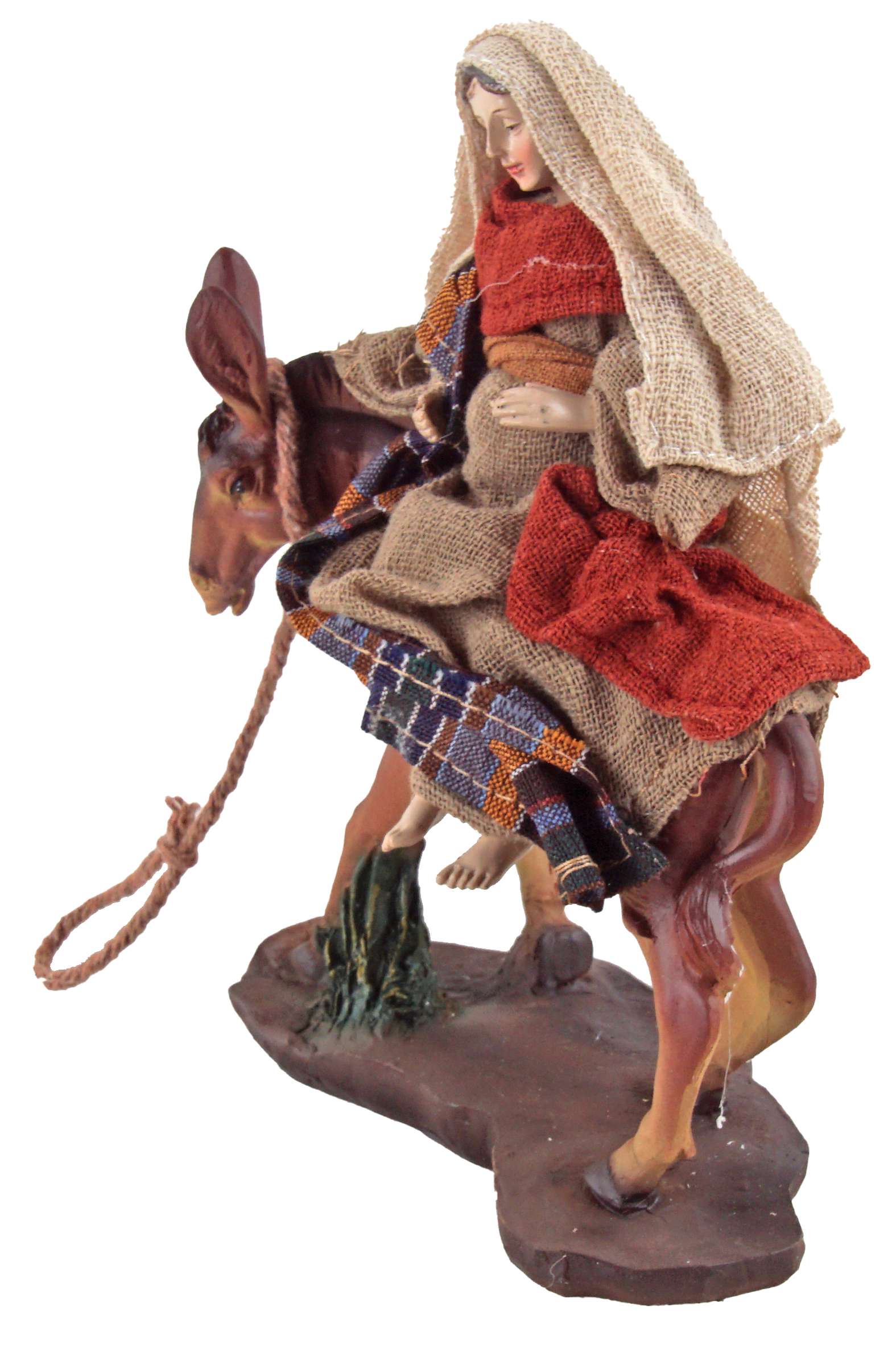 Maria sitzt sanft auf einem Esel, in warme Tücher und erdige Stoffe gehüllt, während Josef fürsorglich an ihrer Seite schreitet, den Weg führend mit einem schützenden Blick. Jede Figur ist sorgfältig bemalt und mit naturgetreuen Stoffkleidern versehen, die den Figuren eine lebendige, anrührende Ausstrahlung verleihen.
