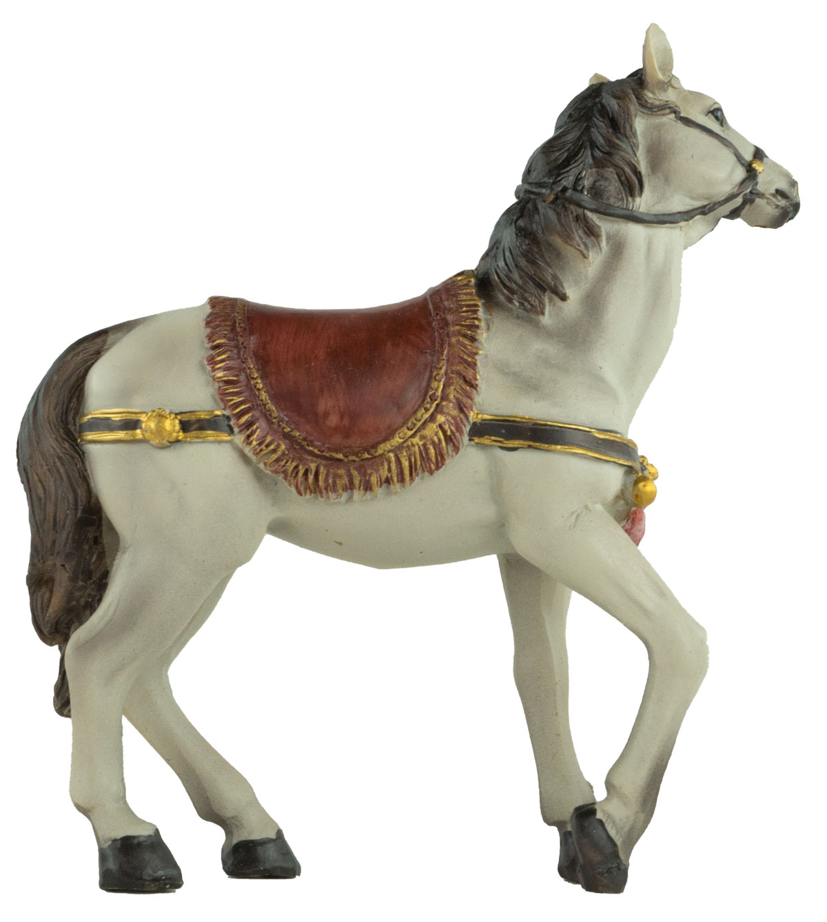 Das Pferd hat weißes Fell, eine schwarze Mähne und einen schwarzen Schweif. Das Ross hat ein aufwendig verziertes Geschirr und einen roten Schmucksattel.