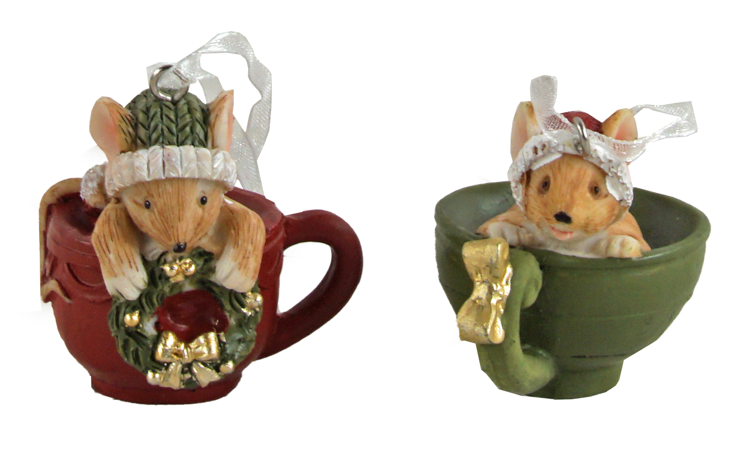 Die eine Maus lugt fröhlich aus einer roten Tasse hervor, eingehüllt in eine grüne Strickmütze und mit einem kleinen Kranz in den Pfötchen – bereit, den Winter zu begrüßen. Ihre Schwester sitzt in einer zarten grünen Tasse mit goldener Schleife, trägt eine hübsche rote Haube und schaut verträumt in die Welt hinaus.