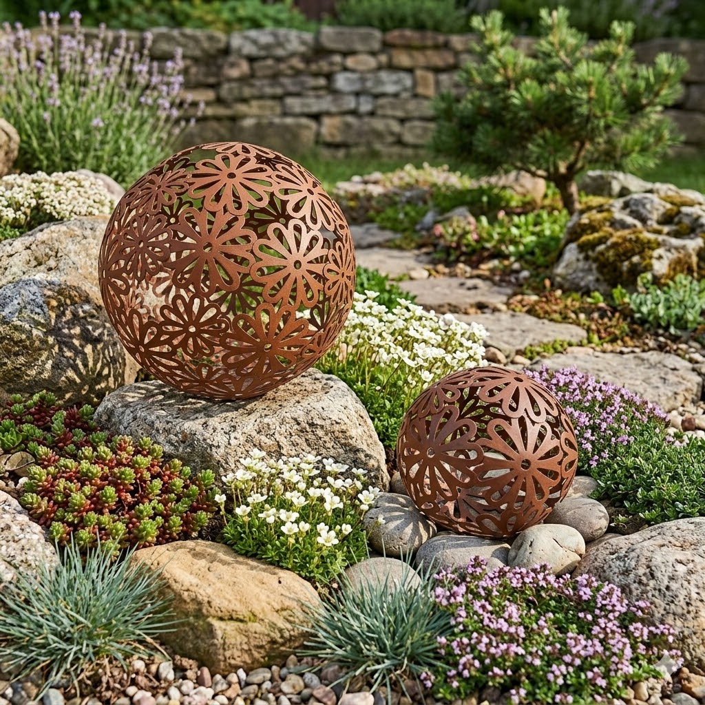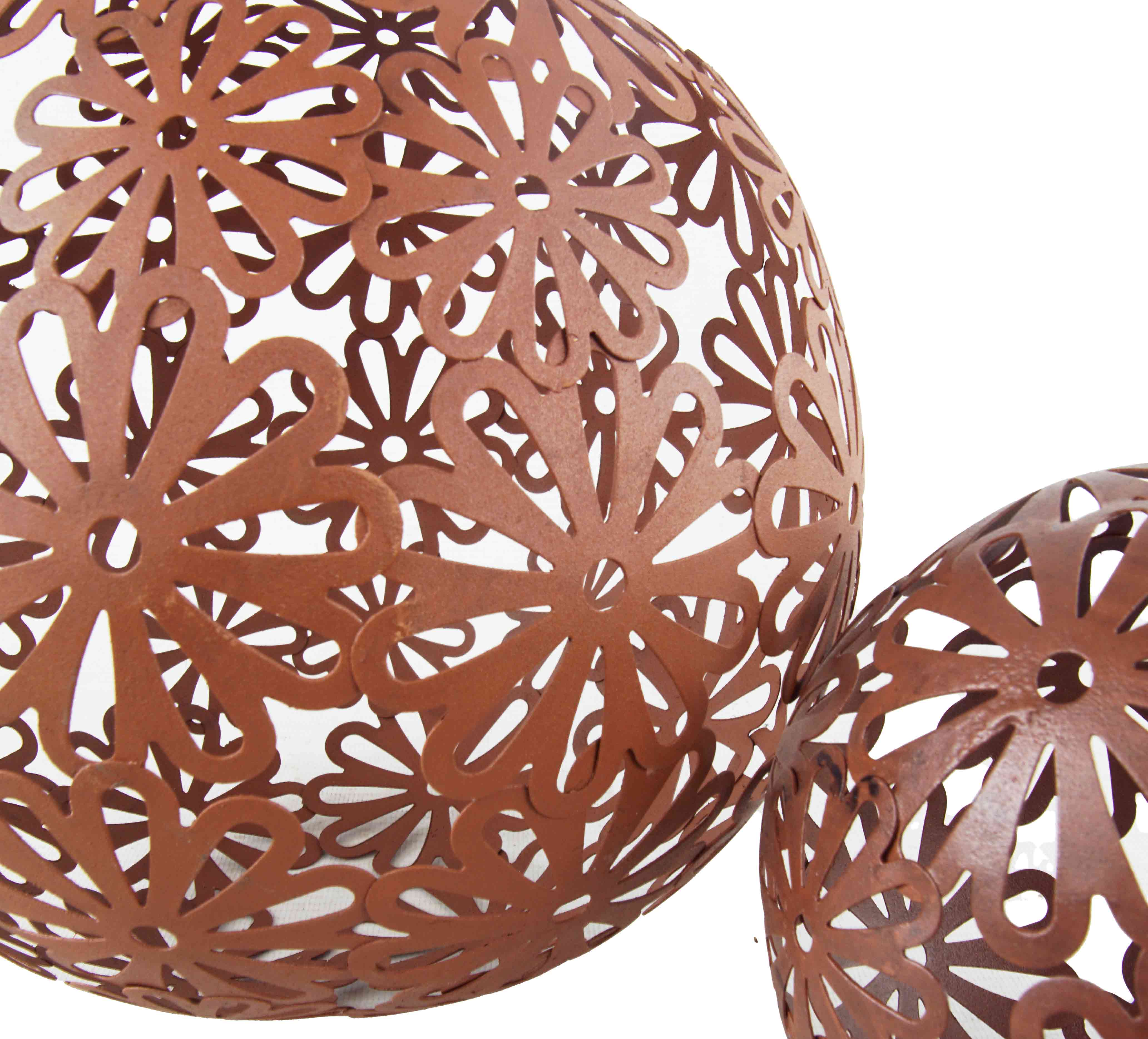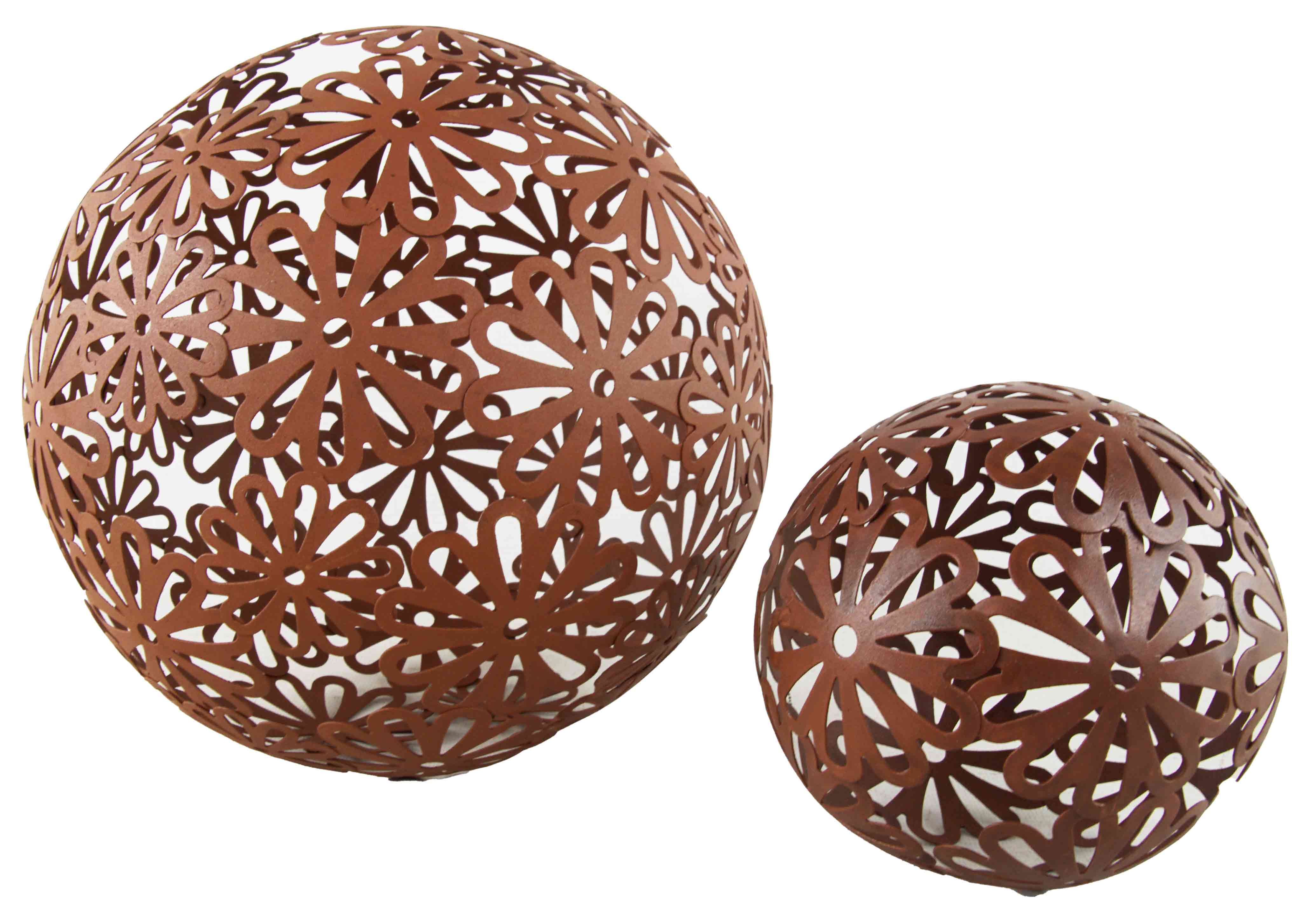 Dieses 2er-Set Dekokugeln in Rostoptik verleiht Ihrem Garten einen Hauch von Vintage-Charme. Die aus filigranen Blütenmustern gefertigten Kugeln ziehen alle Blicke auf sich und sorgen für ein stilvolles Ambiente. Ein perfekter Hingucker in Beeten, auf der Terrasse oder als Deko-Highlight im Eingangsbereich.